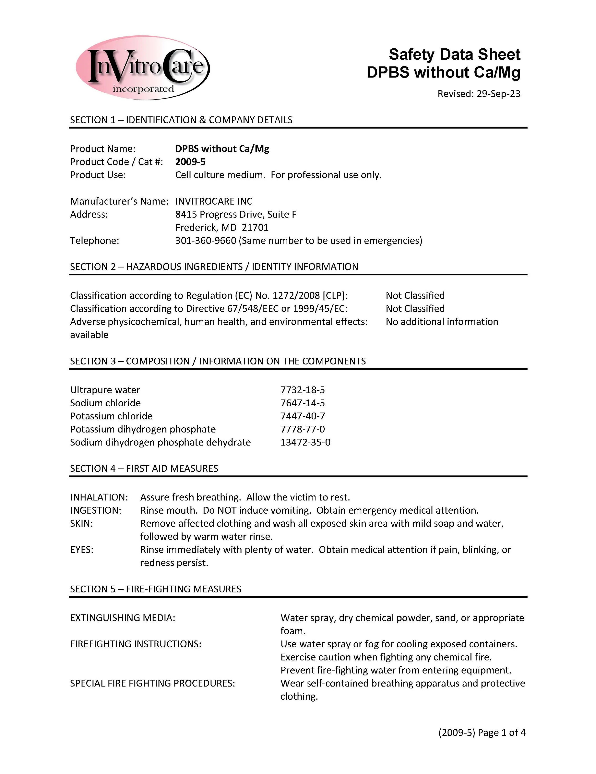 DPBS DPBS Cat # 2009-5 500ml Without calcium and magnesium (Cat # 2009-5)Provided in 500ml plastic bottles**FOR FURTHER MANUFACTURING OR LABORATORY USE ONLY** 2-year shelf life SDS